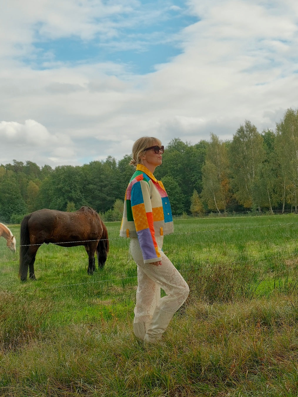One of a kind. Handcrafted and 100 % recycled. Made from mixed recycled materials. Lined with a quilted bedspread. All the materials are curated and recycled. The finish is in top condition and feels like new.
